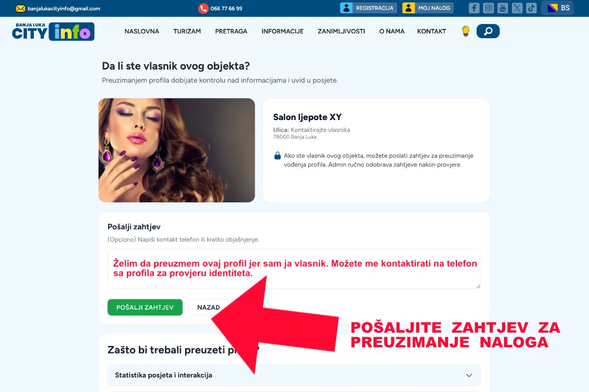 Ako je vaš objekat već prikazan na platformi Banja Luka City Info, preuzimanje profila je najbolji način da ostvarite potpunu kontrolu nad online prisustvom svoje firme.